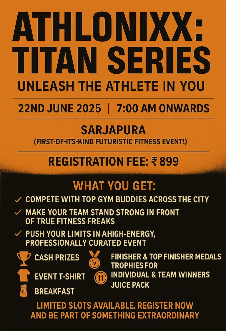 Titan Series, a premier fitness challenge happening on 22nd June 2025 @Mana Sports Turf. Win Cash Prizes, Medal, Certificates, Free Health Checkup & more!!!